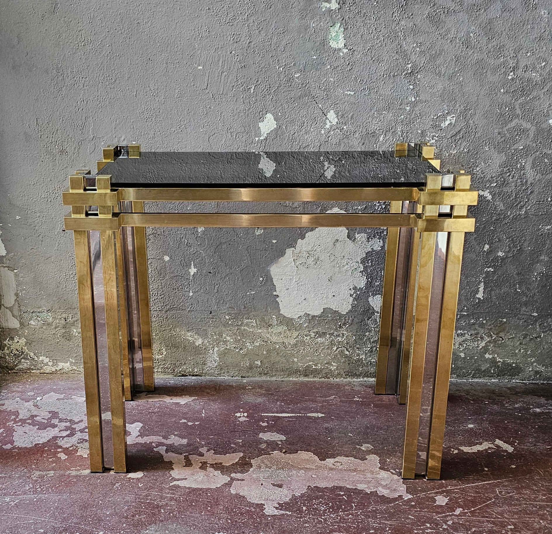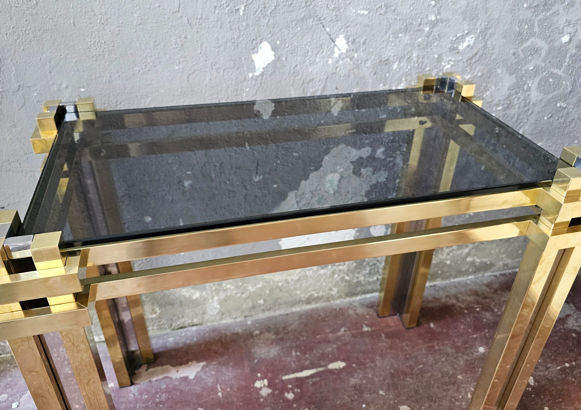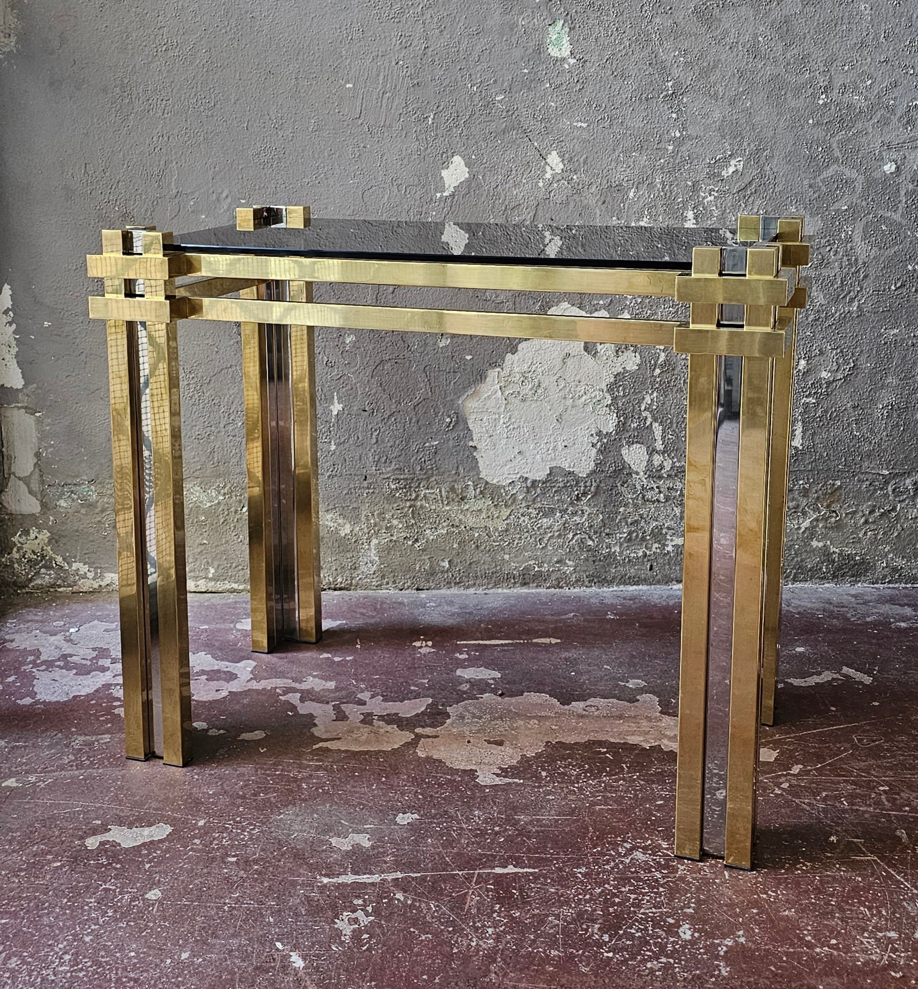 Struttura in ottone e acciaio con piano in vetro fumè.